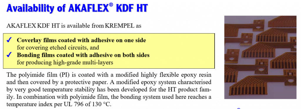 KDF is a coverlay or bonding film, containing a polyimide film coated with an adhesive on either one side for use with etched circuits, or both sides when used to produce high-grade multilayers. The thickness of both the PI and the adhesive can be adjusted as needed, and all materials are suitable for up to 130°C.