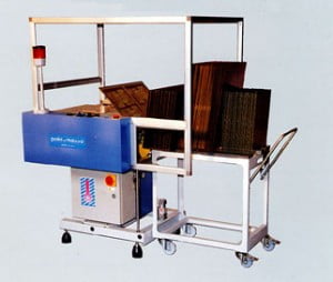 The rack is conveniently moved to/from its trolley for easy handling in the factory.